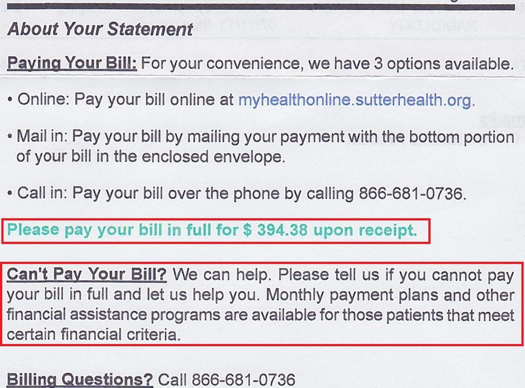First notice that it says they want the full amount. Then it says if we can’t pay it there are payment and other options available if you meet certain financial criteria. Now this didn’t phase me since I thought in our situation surely we qualify to at least make payments. We do NOT! Not only that but calling the billing number we were told that they’re not really set up for any kind of long-term payment plan and they would have to refer us to an third-party agency to handle this. They were supposedly going to allow us a longer term payment with 0% interest. Imagine our surprise when we received the following. Also take note that we did make a $30.00 payment within the last 30 days.