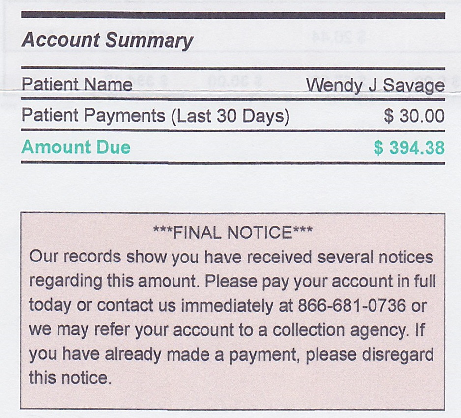 You would think a system with pricing like that might be able to work with a cancer/chemo patient who can’t afford the full brunt of the bills all at once (what insurance didn’t pay) and many of you who saw my previous post assured me that as long as we paid even $10.00 a month the hospital would have to work with us and wouldn’t send us to collections. I knew that wasn’t going to be the case and while I appreciate the feedback I have to call BS on the suggestions. Not only was the hospital not happy with a monthly payment, not even $30.00, they wanted to whole thing up front. I want you to notice something on the bill they sent us a few weeks ago.