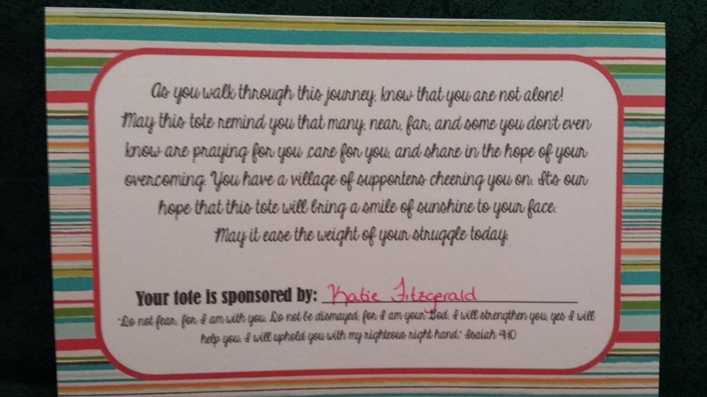 I got a bright, pretty new chemo bag from my niece Katie! It was filled with all kinds of goodies. I had so much fun checking everything out. The bag has lots of pockets and each pocket had a treat in it. I have already put several of the items to good use! I can’t wait to take it with me to my next chemo appointment!