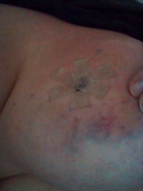 The biopsy was an ultrasound guided needle core biopsy. They took several tissue samples of the lump in my right breast as well as samples of one highly suspicious lymph node under my arm. As a bonus they gave me two little tiny titanium clips, one in the lump, one in the lymph node. Wasn’t that nice of them?! If you are really brave, click the thumbnails below to see pictures. PICTURES….EWWWW! =P