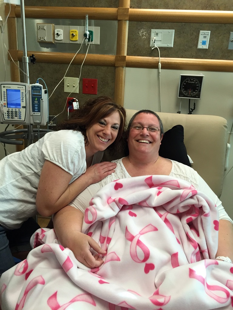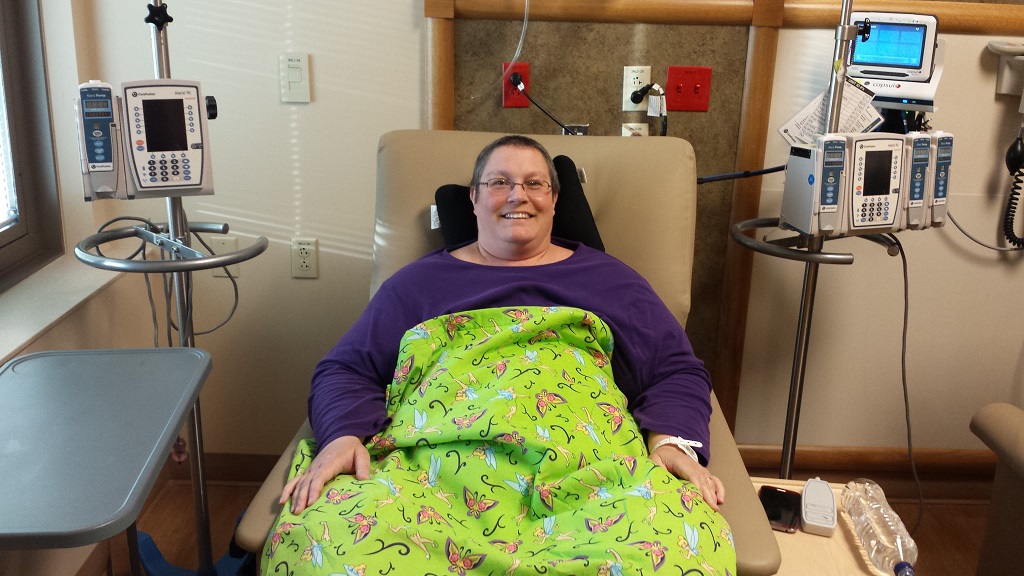I would like to be able to say my last two chemo treatments weren’t too bad, as I didn’t have the problems I had with the double whammy chemo but I still don’t feel as good as I would hope. Sometimes I think I’m just getting used to feeling crappy all the time so that has just become my “normal”. I didn’t lose anymore weight, in fact I gained back 10 of the 15 pounds I had lost the second time around and my weight is holding steady. Here is a picture from one of the previous treatments.