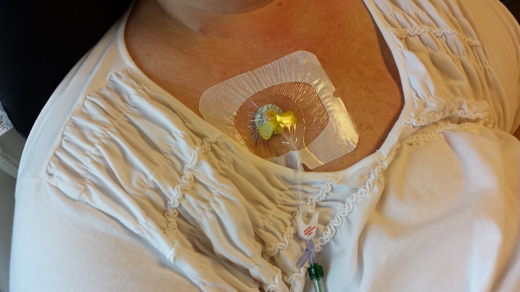 The next picture is a close up of where the nurses hook into my port. This is the path by which all that lovely chemo makes it into my body.
