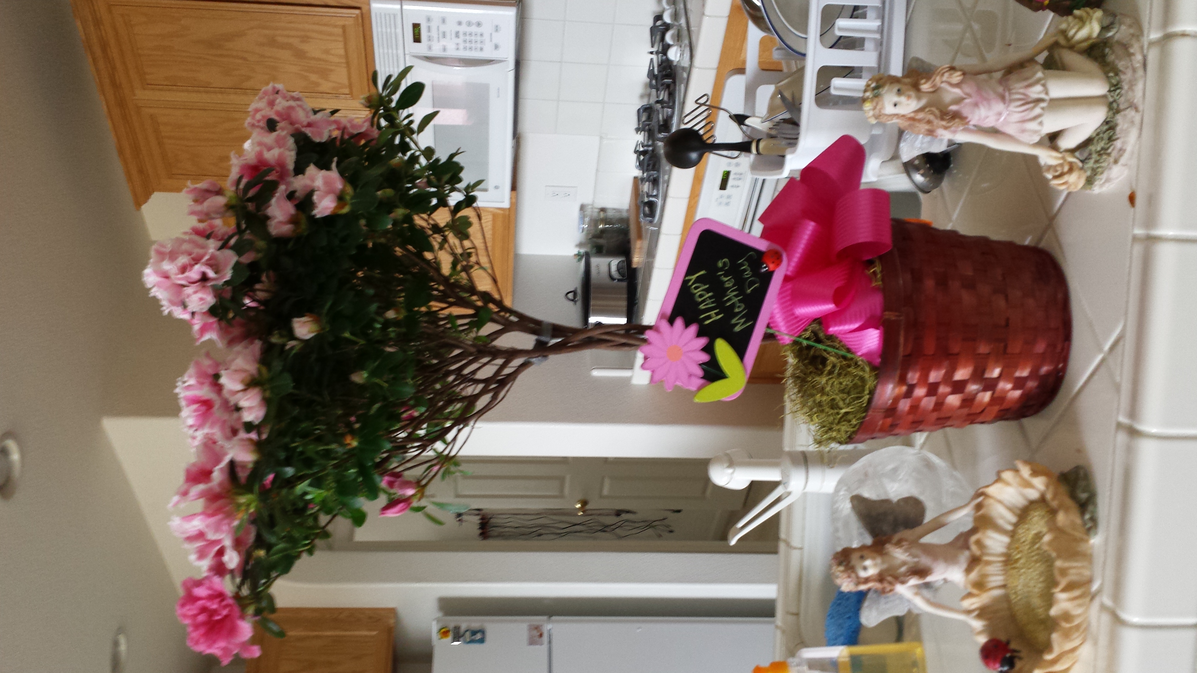 My son Josh and his girlfriend Megan came walking in with this beautiful tree for me for Mother’s Day! As you can see it was covered in beautiful pink blooms! They also had brought a beautiful basket of orange freesia’s for Chris’s mom, but unfortunately she couldn’t take the plant on the plane back to New York so I inherited the lovely looking and smelling plant for myself. YAY me!