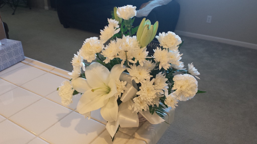 So, other surprises…several days ago I received a bouquet of flowers from Jim & Betsy Balshuweit / Diane & Pete Smith, whom I have never met, but have heard about from Wendy who is Jim and Diane’s sister. So thanks for the flowers! They’ve brightened up the place a bit.
