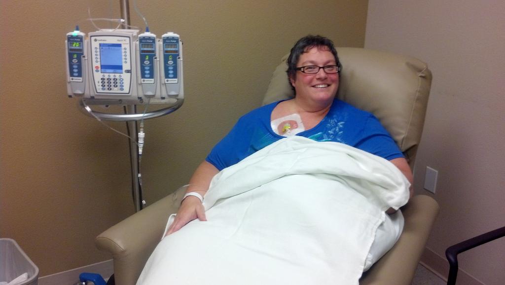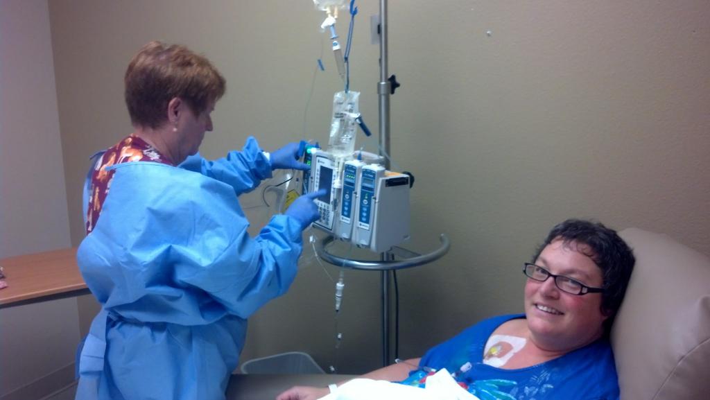 I get set down in a comfy recliner and the whole process begins. Nurse Sheri accessed the port in my chest with a needle and got a saline drip going. Then she offered me a warm blanket and a pillow for added comfyness! After ten or so minutes of the saline drip running, the first set of meds to arrive were consecutive IV drip bags of stuff to help combat the side effects of what was yet to come. Each IV bag took just over 15 minutes. Then came the dreaded “Red Devil” aka adriamycin. Two GIGANTIC syringes filled with what looked like the reddest red Kool-Aid you can imagine. Those had to be administered by the nurse as a “push” meaning she sat there next to me for about 15 minutes slowly injecting the toxic cocktail into my IV line. But just before she started she said, “Wendy I just want you to know that there will be an almost immediate side effect from the drug. Your pee will turn red.” Here’s me, “Oh good so I don’t have to panic thinking I’m hemorrhaging then.” Like I said, she has a good sense of humor and got a chuckle from it. Okay, so I make it through the dreaded Red Devil. Woohoo! One down, one to go. Next up Cytoxan. This little beauty is related to nitrogen mustard. This came in the form of an average sized IV drip bag that took about an hour or so to complete. Again I didn’t have any reactions to it so I was pretty pleased with how it all went. After all the drugs were pumped into me I just had two small things left. A saline push (saline in a syringe) to make sure all the drugs were through the port and into my body, and then a Heparin push to ensure that nothing clots in my port before the next visit. Done! So, in total I was there for about 4 hours today. Not too shabby. See a couple of pics the hubby took.